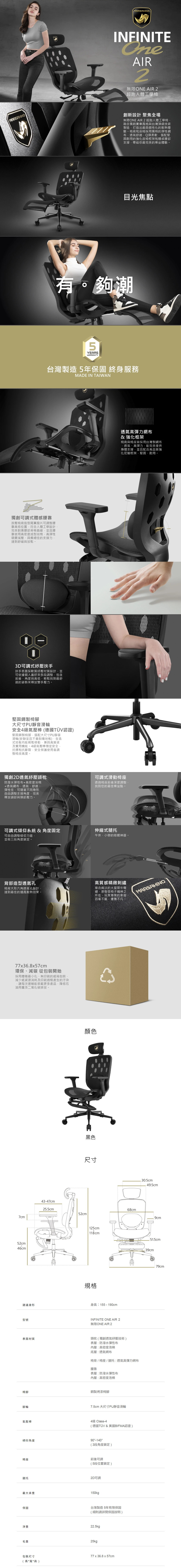 ● 1年保固:頭枕、扶手總成、底盤機構、腿托、氣壓棒、腳輪 ● 商品須自行簡易安裝,組裝前請詳閱說明書 ● 保固細則請詳閱官網說明